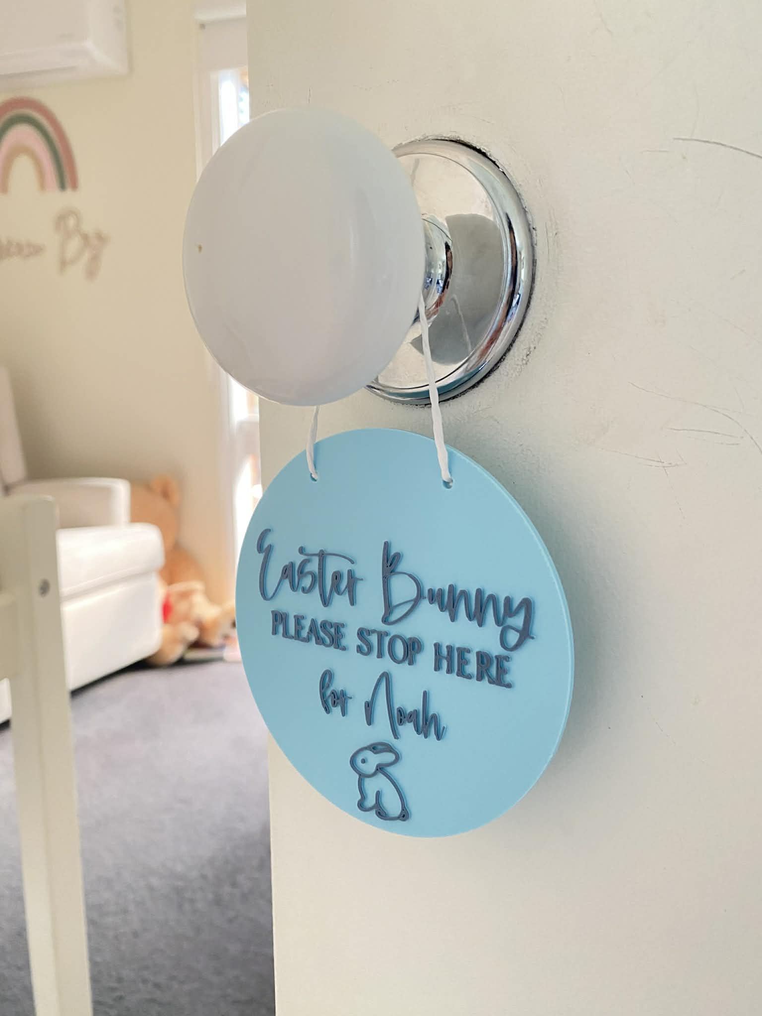Our ‘Bunny Please Stop Here’ plaques are the perfect way to for your little ones to let the Easter Bunny know to visit! A great keepsake for mothers and fathers & addition to those Easter photos. Each plaque has the option of holes or no holes (string included) and is personalised with your children’s names. This plaque can be used as Easter décor in your home giving the room a personalised touch.