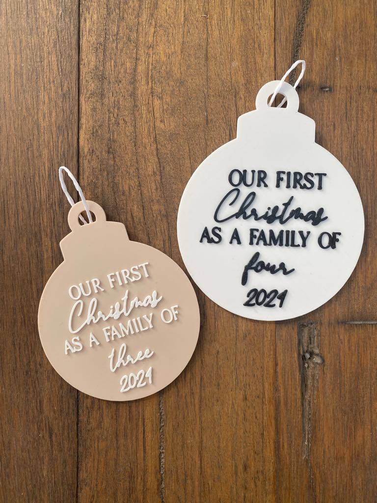 Our ‘First As A Family Of Christmas Decoration’ is the perfect personalised addition to your Christmas tree this year! A great way for mothers, fathers and family’s to remember their first Christmas with their newest family member. Our First As A Family Of Christmas Decoration is available in two sizes.
