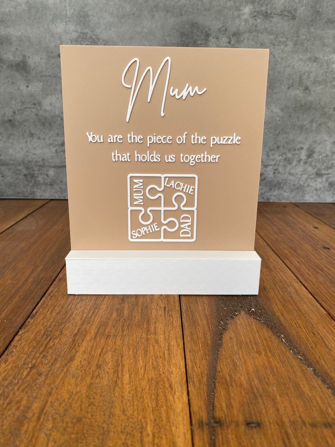 Our ‘Missing Puzzle Piece Plaque’ is the perfect personalised gift to give your Mum this Mothers Day! Personalise with your name and your children’s names. A great gift for mum, aunty or nanna! You can choose as many names as you like extra puzzle pieces will be added if needed. Choose to add a stand if you like and choose the size!