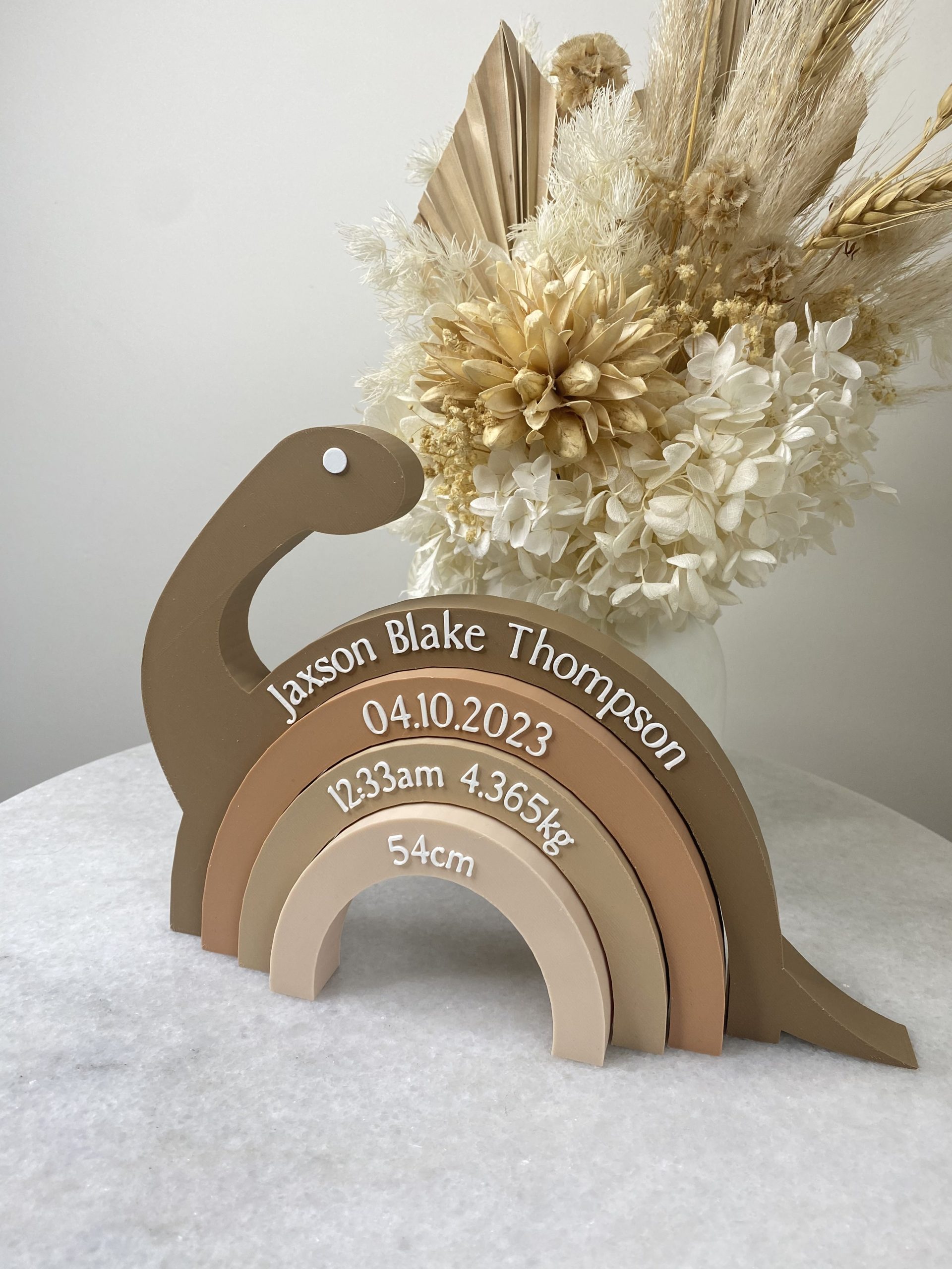 Our Dino Stacker 2 are a completely unique personalised piece of nursery décor. They can be used to display your little ones birth details, just their name or have your whole family’s names on them. A lovely keepsake to enjoy for years to come.