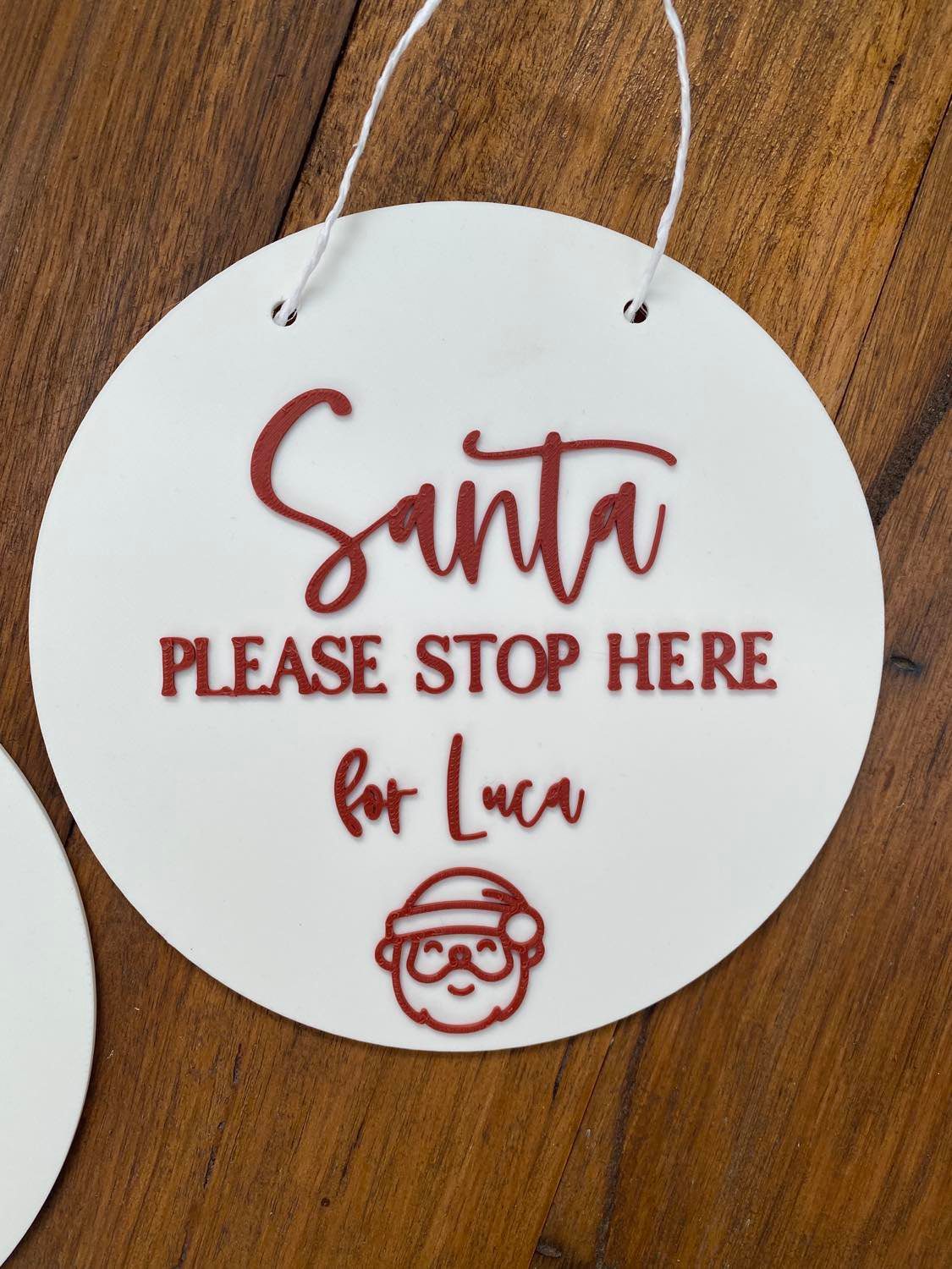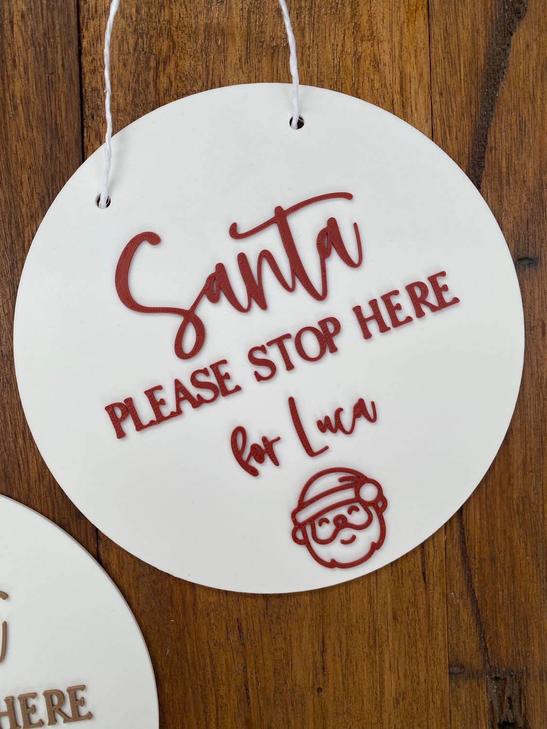 Our ‘Santa Please Stop Here’ plaques are the perfect way to for your little ones to let the Santa know to visit! A great keepsake for mothers and fathers & addition to those Christmas photos.  Each plaque has the option of holes or no holes (string included) and is personalised with your children’s names. This plaque can be used as Christmas décor in your home giving the room a personalised touch.